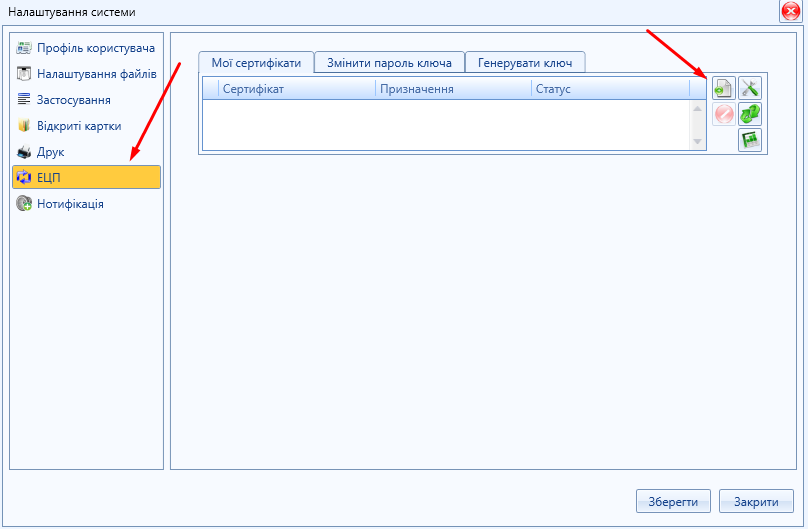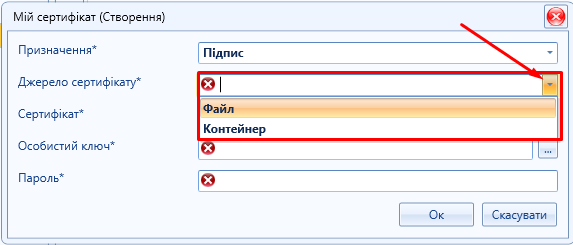 - У вікні, що з’явилось, спочатку обрати джерело сертифікату. Якщо ваш ЕЦП містить лише один файл (ключ і сертифікат в одному файлі), видалити текст «Файл» і обрати варіант «Контейнер». Якщо більше одного файлу (ключ і сертифікат окремо), обрати варіант «Файл»
