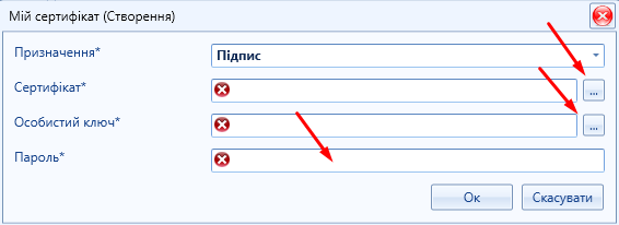 - Після цього обрати файли сертифіката і ключа (у випадку, якщо ви вибрали джерело сертифікату «Файл») на вашому комп’ютері і ввести пароль